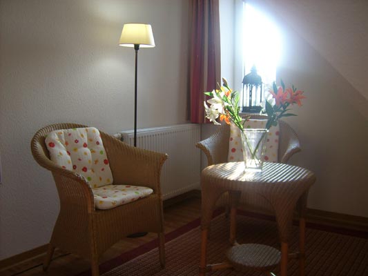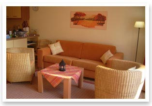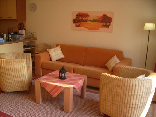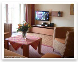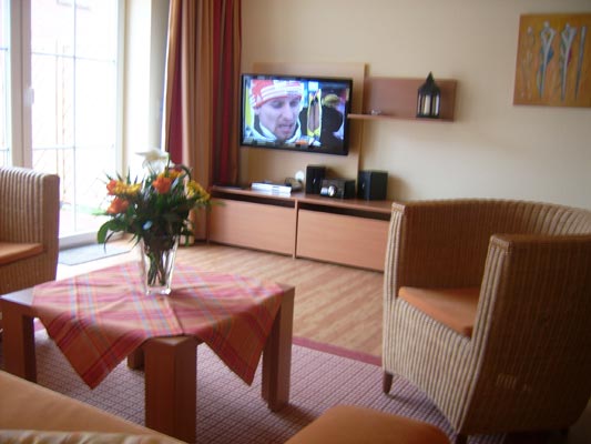 Im Wohnbereich findet sich ein moderner Flachbildschirm (Premiere-Empfang), kostenloser W-LAN-Zugang, ein DVD-Spieler und eine Stereo-Anlage. Gesellschaftsspiele und eine kleine Bibliothek incl. Hörcassetten für Kinder geben Anregungen für die Zeit miteinander.